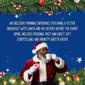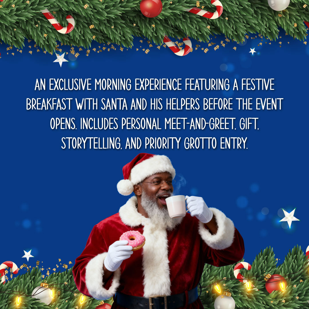 An exclusive morning experience featuring a festive breakfast with Santa and his Helpers before the event opens. Includes personal meet-and-greet, gift, storytelling, and priority grotto entry.